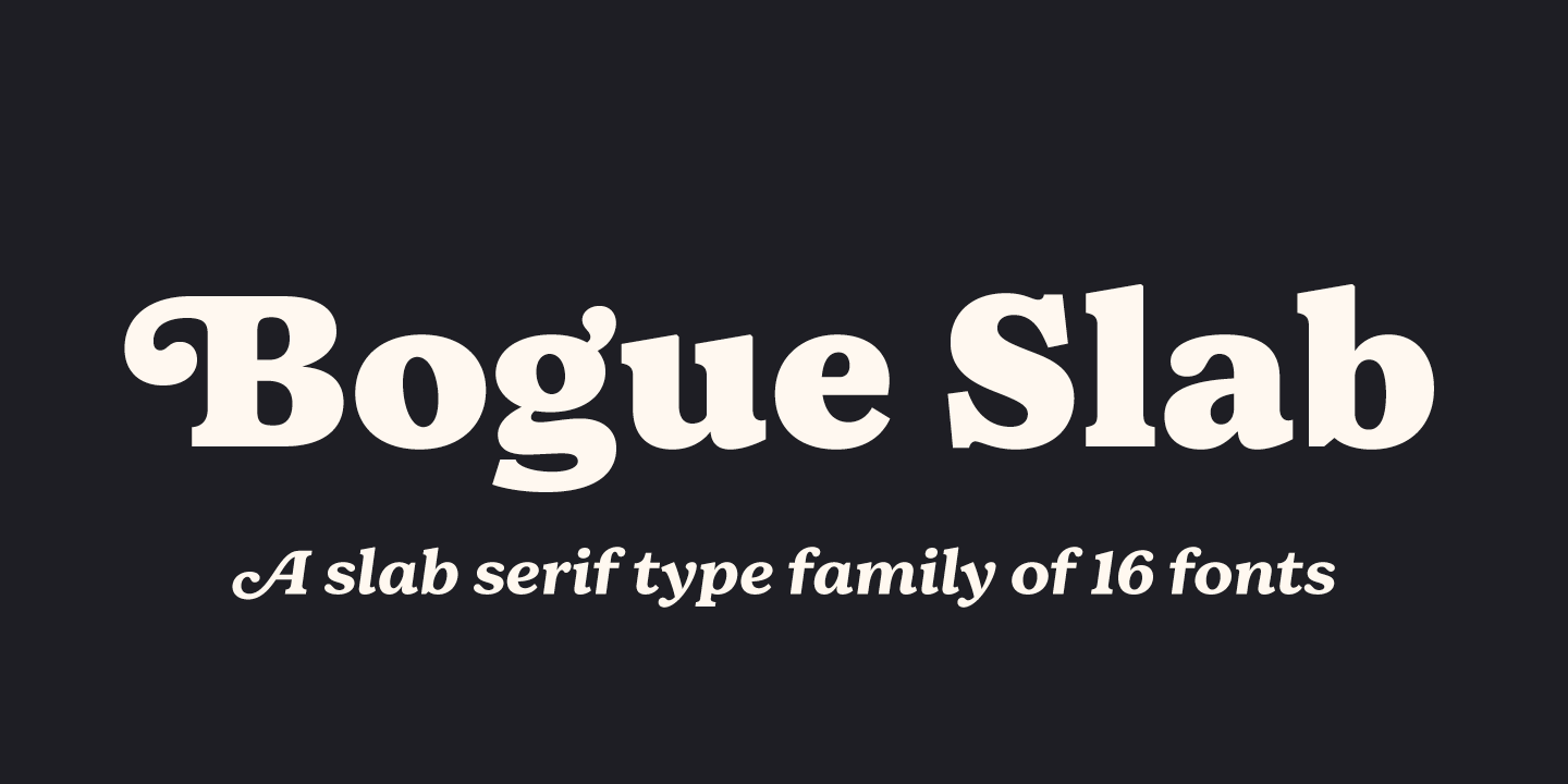 Bogue is a slab serif type family of 8 weights and matching italics. Bogue Slab comes with a lots of stylistic alternates that makes it very versatile in various uses like logos, editorial design, branding, web design, package design and much more. You can use it to create short powerful phrases and headlines and also use it in longer text like lead paragraphs and body texts. So if you are looking for a versatile slab serif font you have found it!